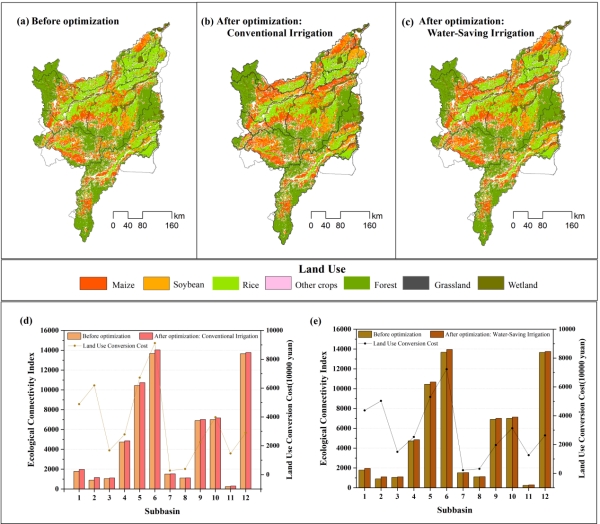 圖5 空間優化配置結果:(a)優化前土地利用類型分布;(b)常規灌溉模式下優化后土地利用類型分布;(c)節水灌溉模式下優化后土地利用類型分布;(d)優化前后常規灌溉模式下生態系統連通性及轉換成本變化;(e)優化前后節水灌溉模式下生態系統連通性及轉換成本變化。